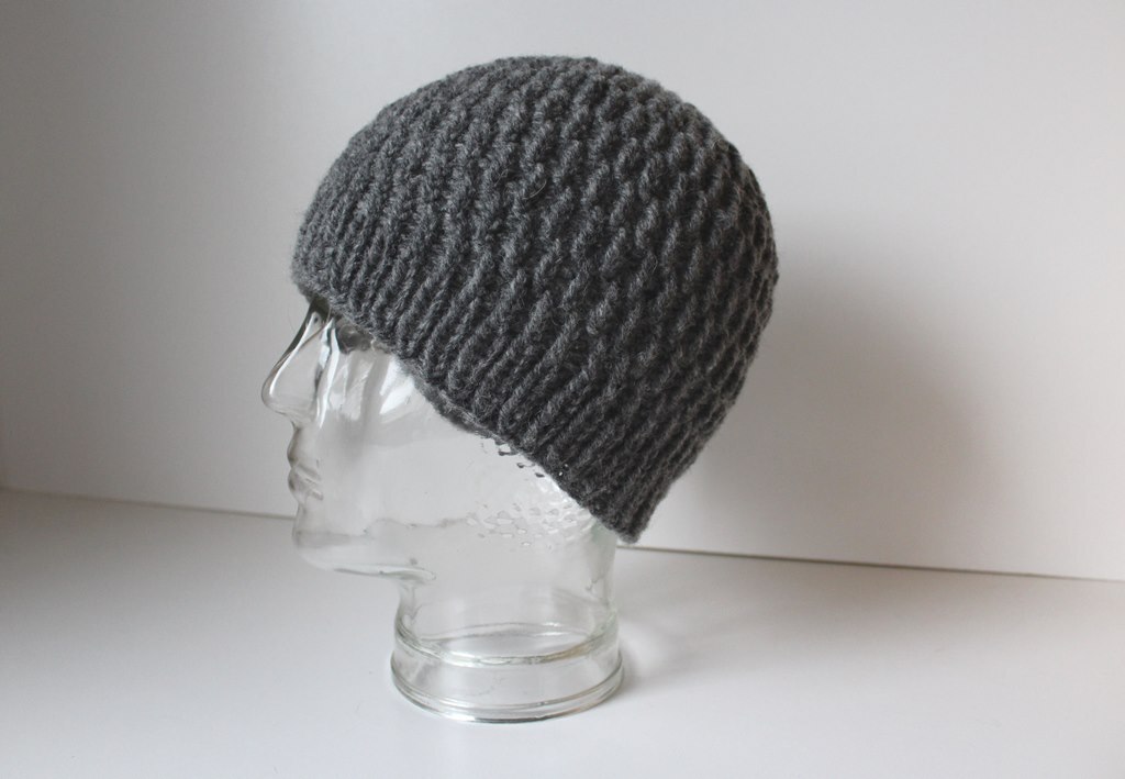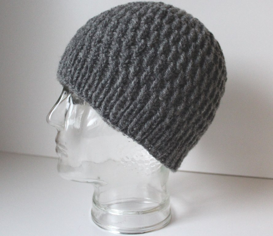 Schnell gestrickte Mütze im Rippenmuster für Männer, Frauen und größere Kinder.