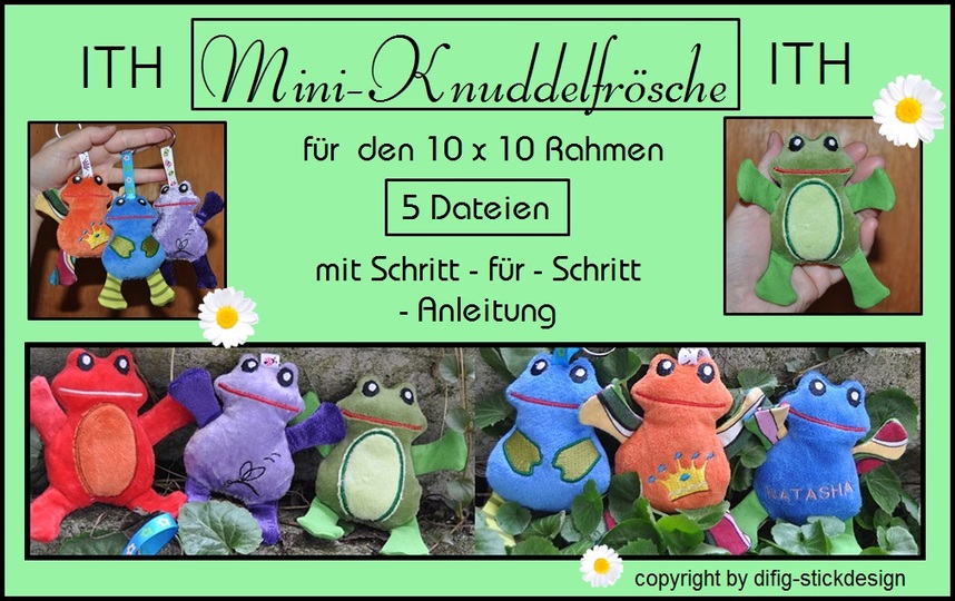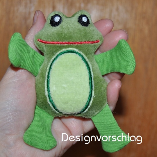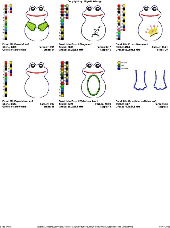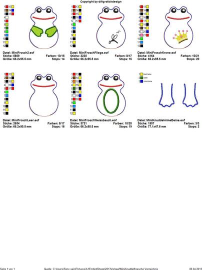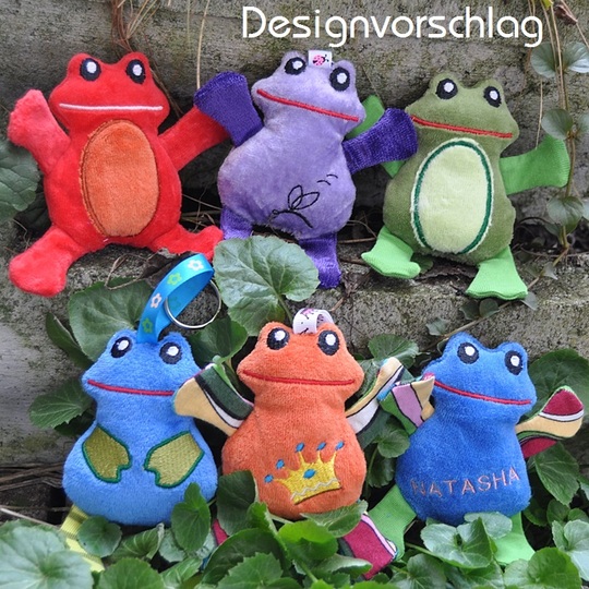 Du bekommst fünf Frosch-Dateien geliefert: Knuddelfrosch mit Fliege un einer mit Krönchen. Dann einer mit gestickten Armen, einer mit weissem Bauch und ein Frosch in blanko, da könnt ihr einen Namen draufsticken oder einfach leer lassen. Dazu selbstverständlich auch Beine und Arme.