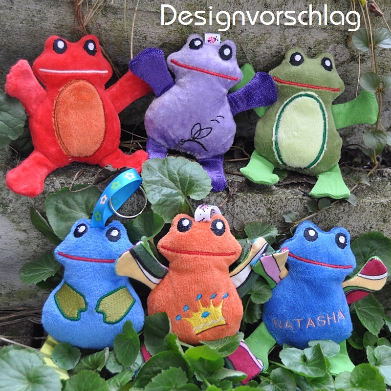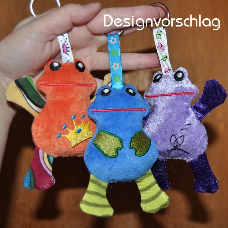 Wahlweise kann man die Frösche mit Bändchen für den Schlüsselanhänger oder Taschenbaumler sticken oder einfach so zum knuddeln.