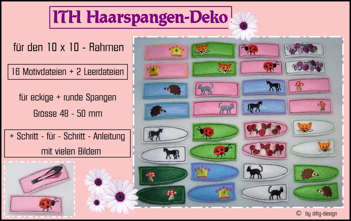 Die Spangen-Deko sind für eckige und runde Haar-Spangen-Rohlinge in der Grösse 4,8 - 50 mm konzipiert.
