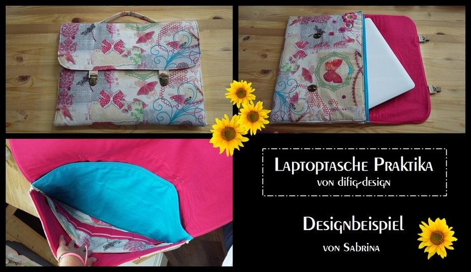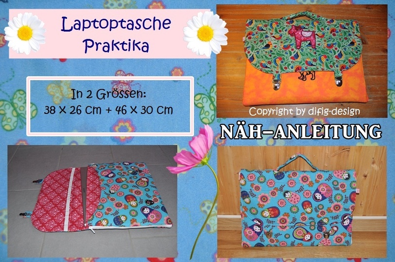 Bebilderte Schritt-für Schritt Anleitung für eine genähte Laptoptasche in zwei Grössen: 38x26 cm und 46x30 cm. Diverse Möglichkeiten und in zwei Grössen und zwei Varianten zu nähen. Die Tasche hat Aussen-Taschen und 2 Reissverschluss-Taschen, damit man sie öffnen und aufklappen kann. Das Laptop ist durch ein zusätzliches Einschiebefach und Polsterung durch Filz oder Vlies gut geschützt. Die Praktika wurde auch von Anfängern mit Erfolg probegenäht.