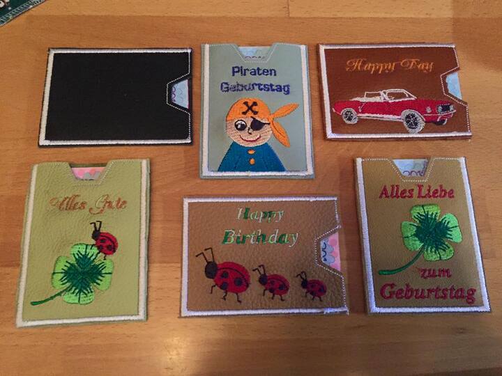 Geschenkkarten sind sehr beliebt und werden auch oft verschenkt. Nun aber wohin mit ihnen? Oft sind die Verpackungen der Karten nicht der Brüller oder oft kauft man sie sogar ohne Umhüllung. Viel persönlicher wird es mit diesen Hüllen, die man in Leder oder mit Filz auf der eigenen Stickmaschine sticken kann. Am Schluss werden sie ausgeschnitten und sind sofort einsatzbereit.