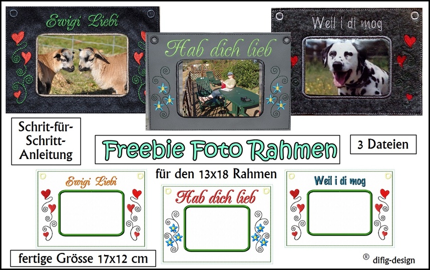 Die Stickdateien habe ich in den Formaten pes, hus, jef, exp, vip, vp3 und dst in einen Zip-Ordner verpackt. Mit im Ordner eine ausführlich bebilderte Schritt-für-Schritt-Anleitung, so wie man es sich gewöhnt ist von difig-design.