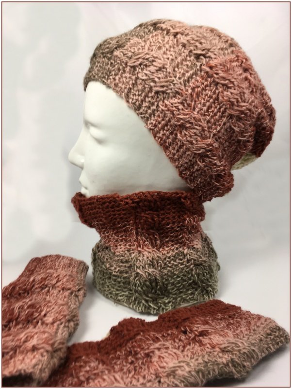 Wunschgemäß kann eine Beanie oder eine Mütze gehäkelt werden. Bei einer Mütze kann der Halswärmer etwas höher gearbeitet werden.