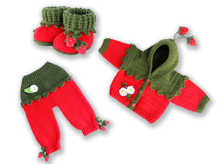 Drei PDF-Häkelanleitungen bestehend aus bebilderten Anleitungen zum Häkeln von Baby- und Kinderjacke "Erdbeere", Gr. 50-116, Baby- und Kinderhose "Erdbeere", Gr. 50-116 und Babyschuhe "Erdbeere", Gr. 0-12 M.