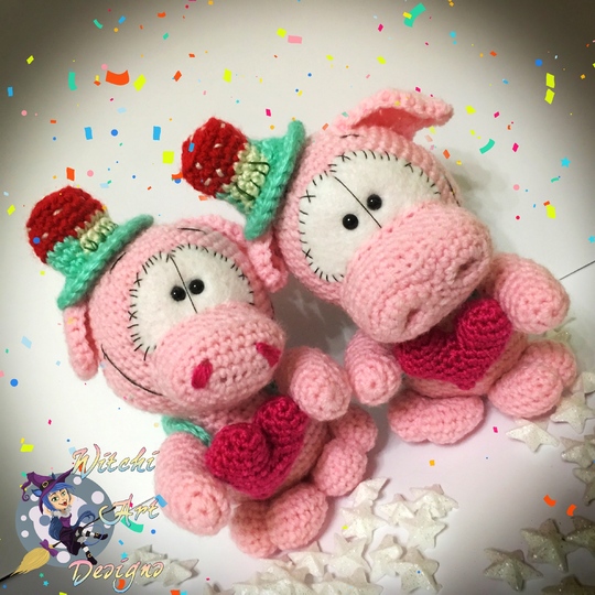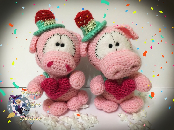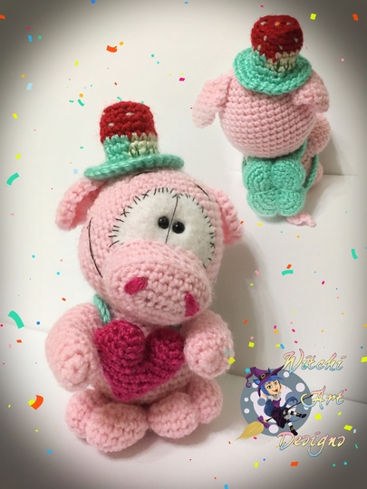 Piglet hat einen Glückskleerucksack, ein Herz in der Hand und einen Zylinder, der aussieht wie ein Fliegenpilz, also Glück pur. :)