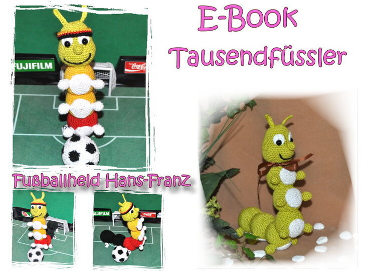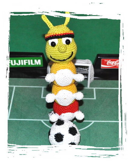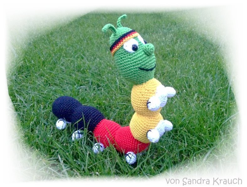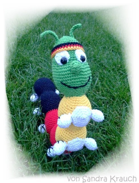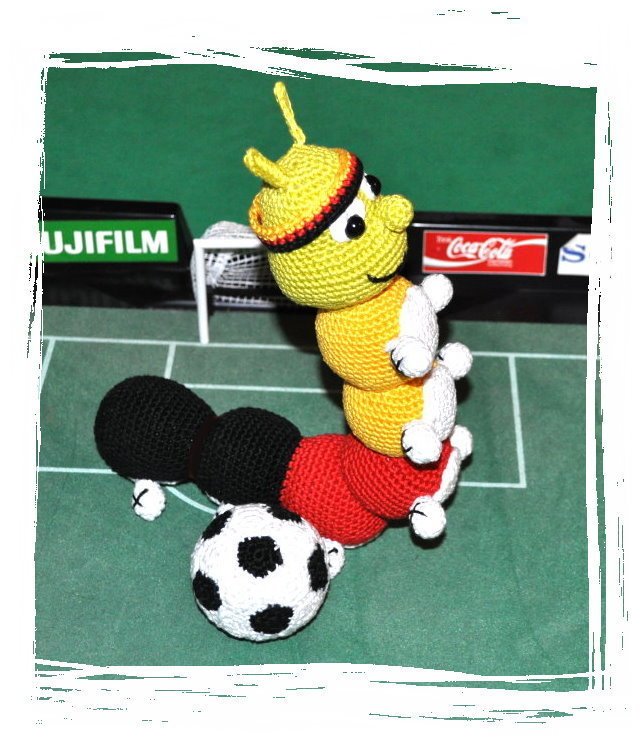 Natürlich kannst Du Hans auch ohne Fußballoutfit häkeln, dann ist er ein ganz normaler und liebenswerter Tausendfüßler ganz bunt, wie es einem am besten gefällt.