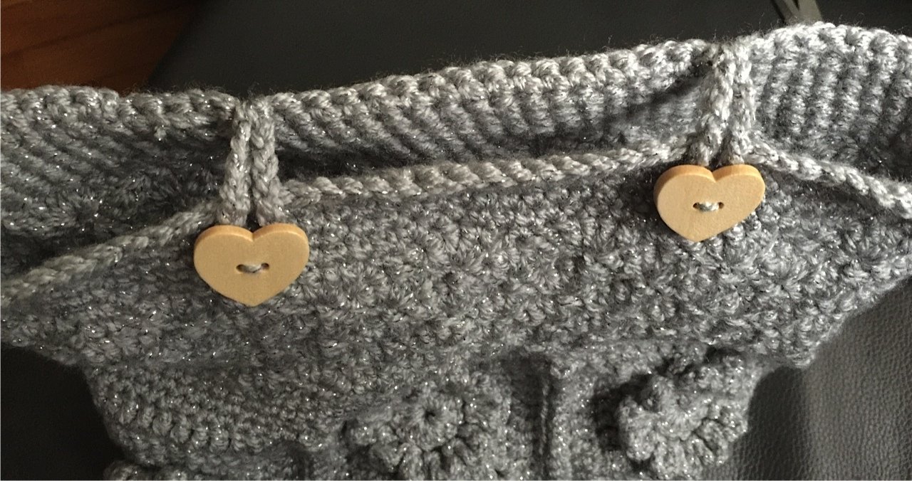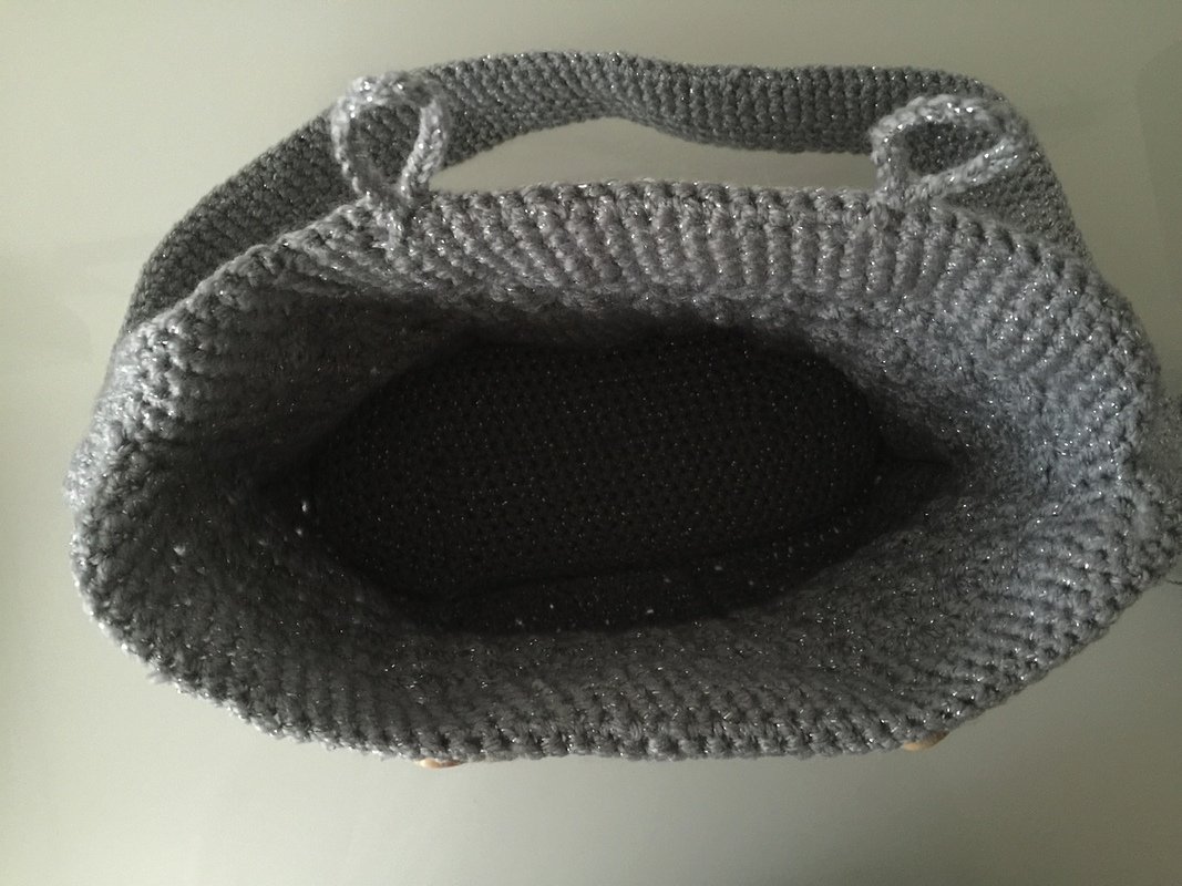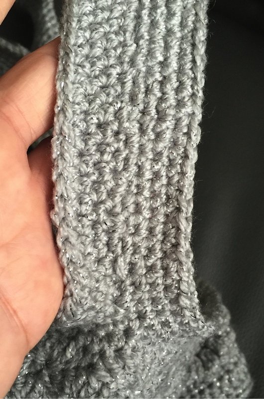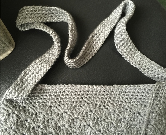 Diese hübsche Tasche ist mit glitzernder Wolle gehäkelt, daher wirkt sie schon etwas edel.