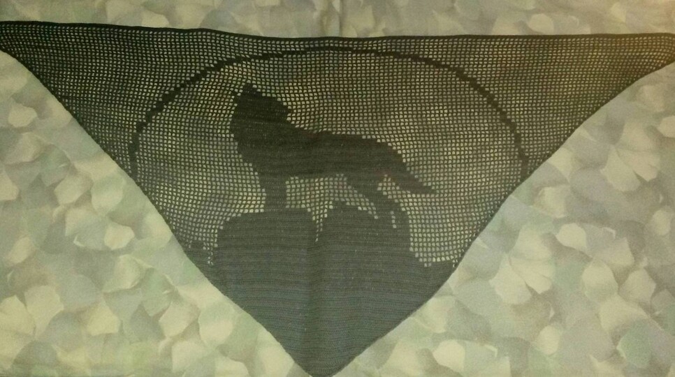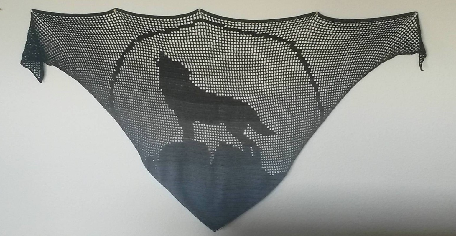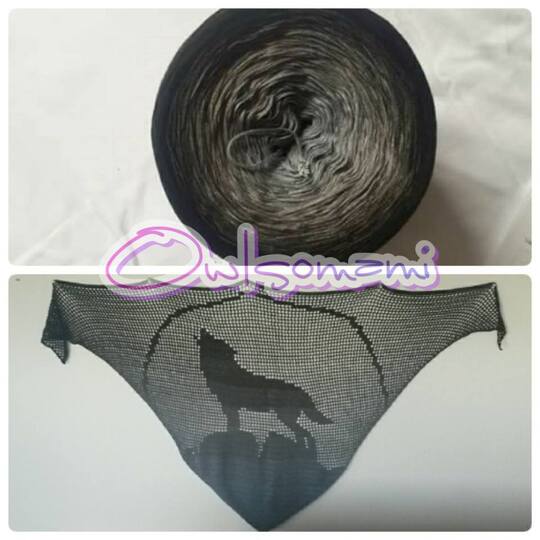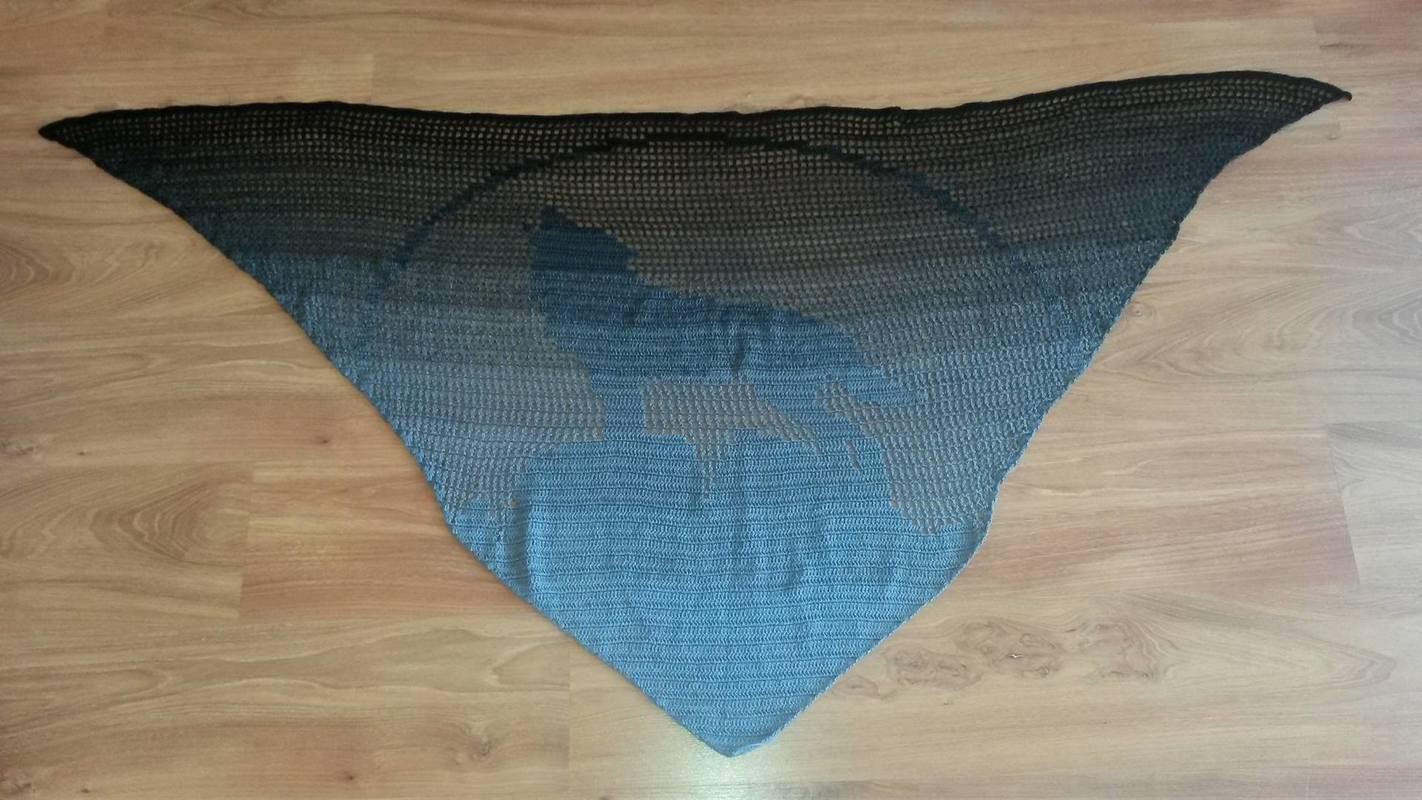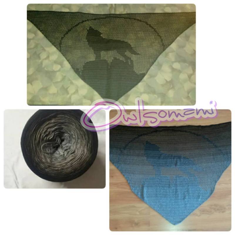 Das Tuch "Akelah" misst aktuell ca. 216 cm x 85 cm und hat einen Verbrauch von ca. 1020 Meter LL bei 3 fädrigem Verlaufsgarn sowie Nadelstärke 3.