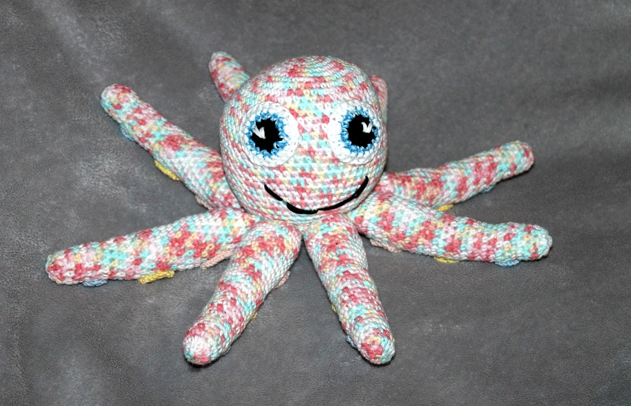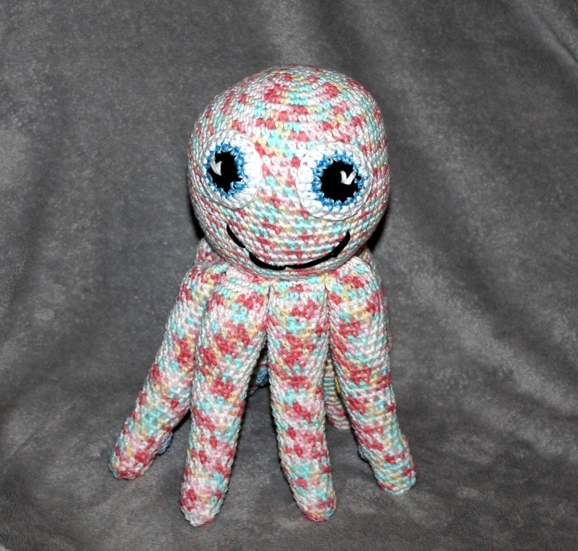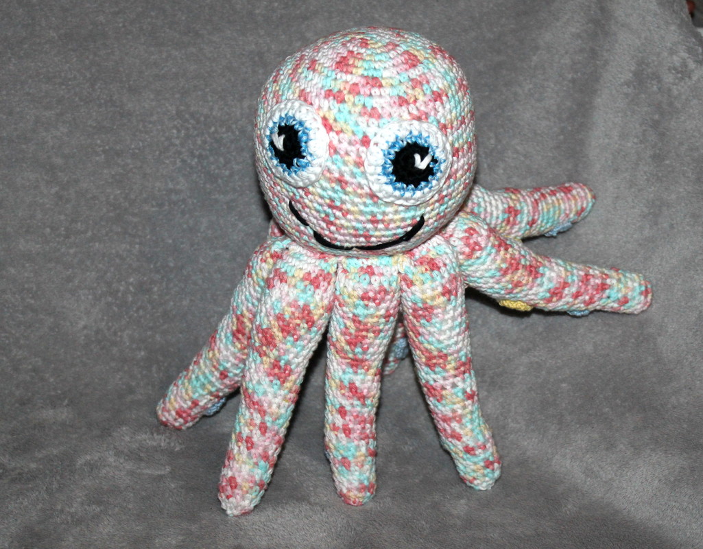 Die fertige Krake ist ca 35 cm groß und auch zum schmusen bestens geeignet.