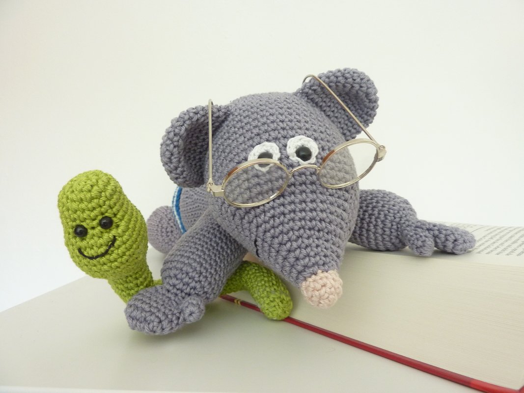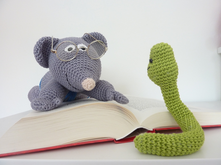 Leon Leseratte wird, unter Verwendung des angegebenen Materials, 39 cm lang (von Nasenspitze bis Fusssohle). Ich persönlich verwende für das Nacharbeiten all meiner Amigurumis und Kuscheltiere Baumwollgarn.