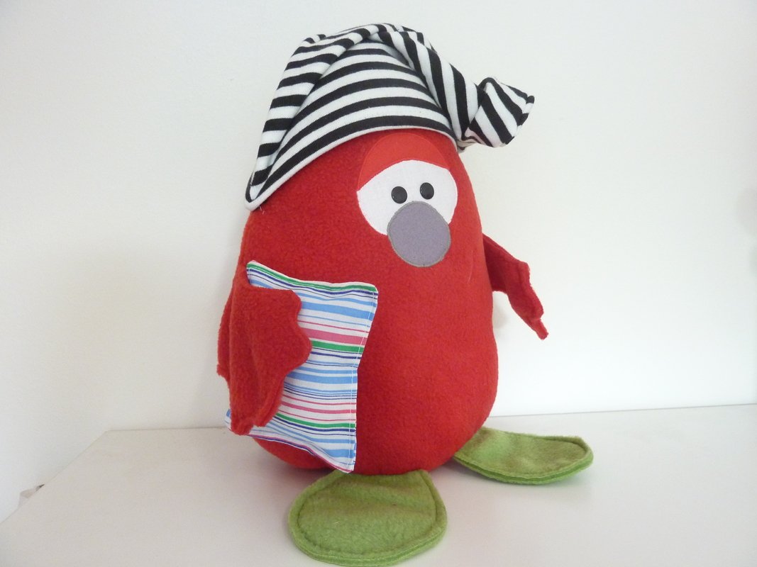 Kuschelmonster Sleepy hat ein ganz großes Hobby: schlafen. Deshalb hat er auch immer sein Kissen dabei und die Schlafmütze auf.