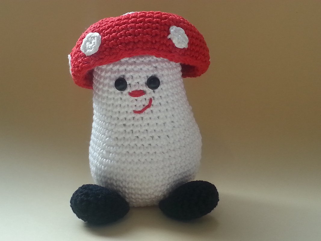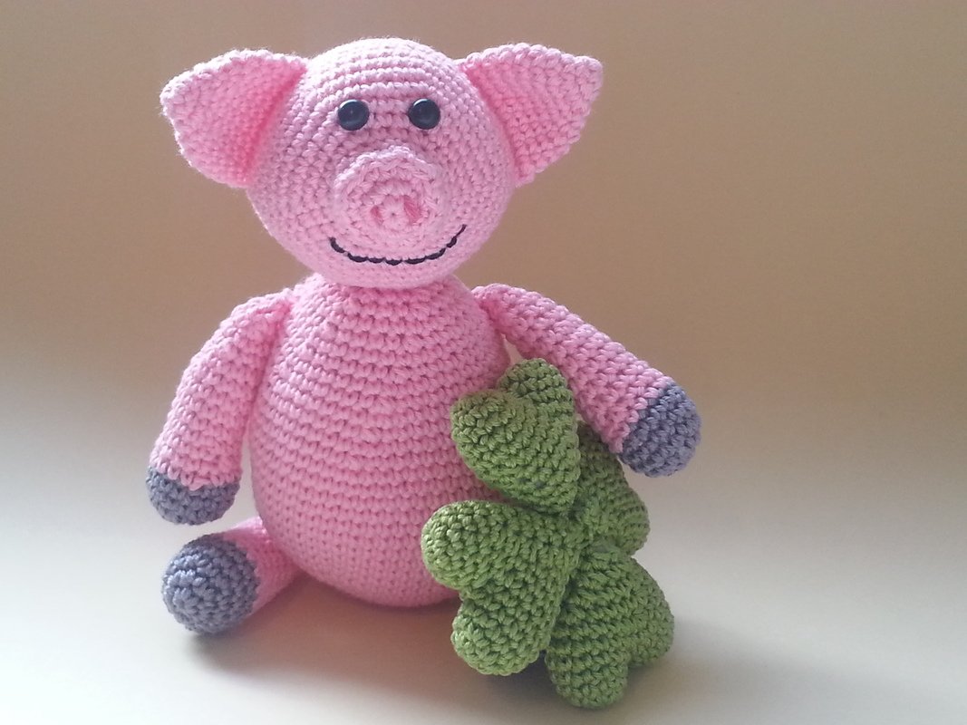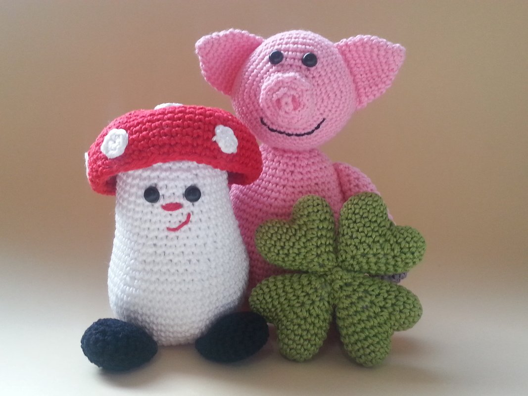 Unter Verwendung des angegebenen Materials und der Nadelstärke werden das Schweinchen 16 cm hoch, der Pilz 11 cm hoch und das Kleeblatt hat einen Durchmesser von 9 cm. Ich persönlich empfehle für das Nacharbeiten all meiner Amigurumis Baumwollgarn.