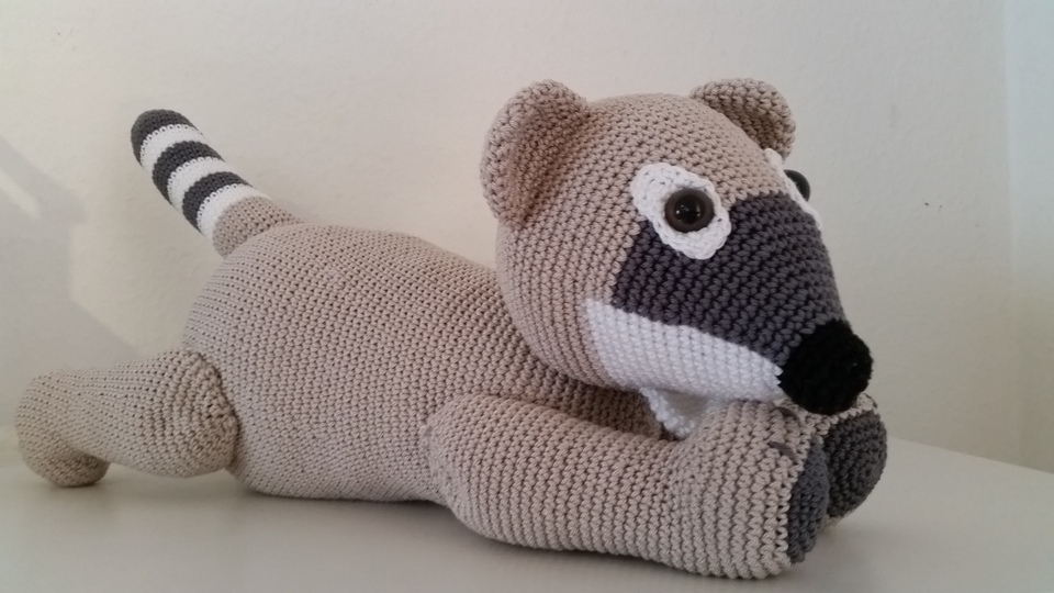 Nino Nasebär wird, unter Verwendung des angegebenen Materials, 44 cm lang. Ich persönlich empfehle für das Nacharbeiten all meiner Amigurumis Baumwollgarn.
