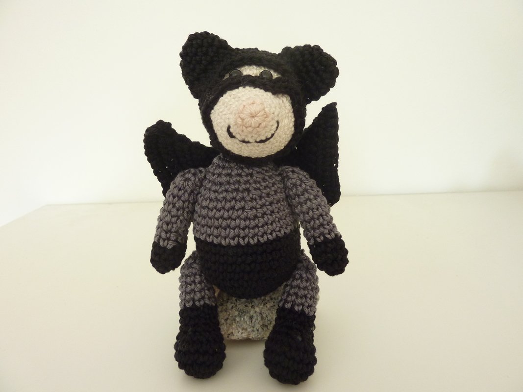Batman-Maus "Mini" wird, unter Verwendung des angegebenen Materials, 15 cm groß und ist ideal, um Garnreste zu verbrauchen.