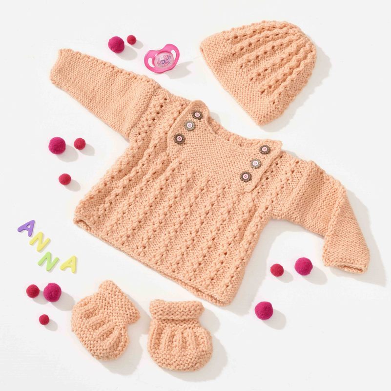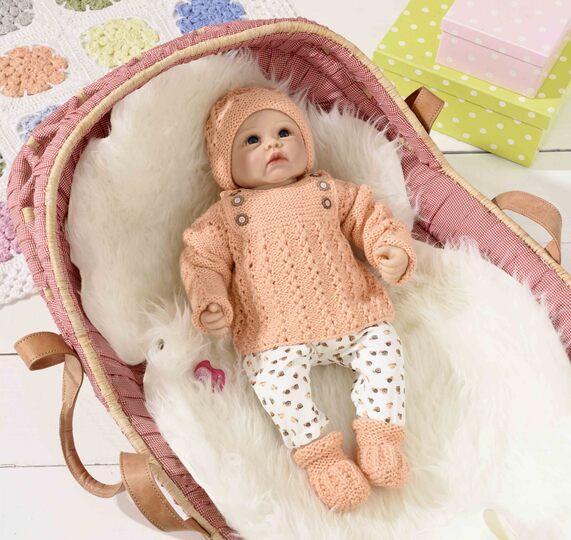 Material: Pro Lana „Baby milk“ (70% Merino fine, 30% Milk fibre, LL = 100 m/25 g), 100 g Natur (Farbe 02), für den Pulli 150 (200) g, für die Mütze und die Schühchen je 50 g Apricot (Farbe 28)