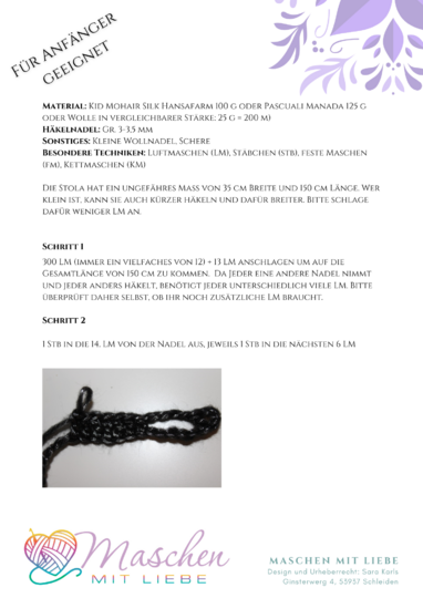 Diese Stola ist nicht nur für festliche Anlässe gedacht. Das Muster besteht aus Luftmaschen und Stäbchen, weshalb auch Anfänger schnell und gut damit zurecht kommen. Das Muster sieht auf Kontrastfarben einfach hinreißend aus.