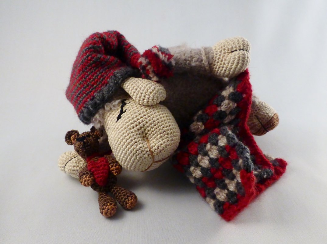 Die Spieluhr und Kuscheltier Schaf Luna hat eine Musikdose im Körper integriert, welche sich abspielt, indem man am Schwänzchen zieht. Die Anleitung beinhaltet zudem die Kuscheldecke, die Mütze und den kleinen Teddy, welcher auch als Taschenbaumler, Schlüsselanhänger oder zum Verschenken an den Liebsten/die Liebste verwendet werden kann.