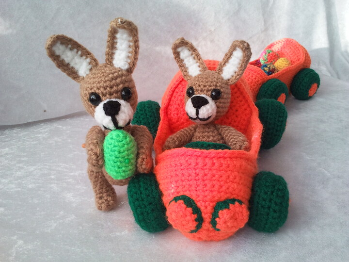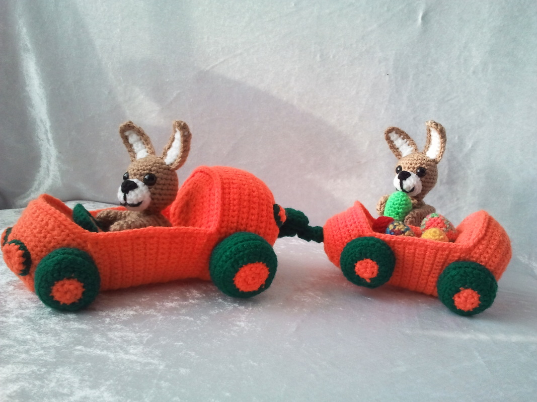 Mit der Schachenmayr Bravo Wolle und 1 Häkelnadel 2,5 werden die Häschen ca. 13 cm groß und das Auto ca.20 cm und der Anhänger 16 cm lang! Dabei kommt es auch darauf an, wie fest oder locker Du häkelst!