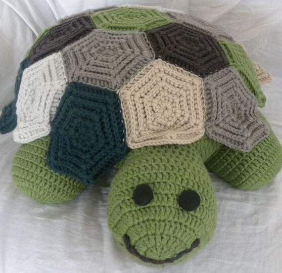 • Schurwolle (Lauflänge = ca. 80 m/50 g): 400 g Hellgrün, je 100 g Beige, Dunkelgrün, Braun und Schlamm, 50 g Hellbeige • 1 Häkelnadel Nr. 6 • 1 Innenkissen, 40 cm Durchmesser • Füllwatte • 1 Reißverschluss, 30 cm • 2 schwarze Knöpfe, 20 mm Durchmesser
