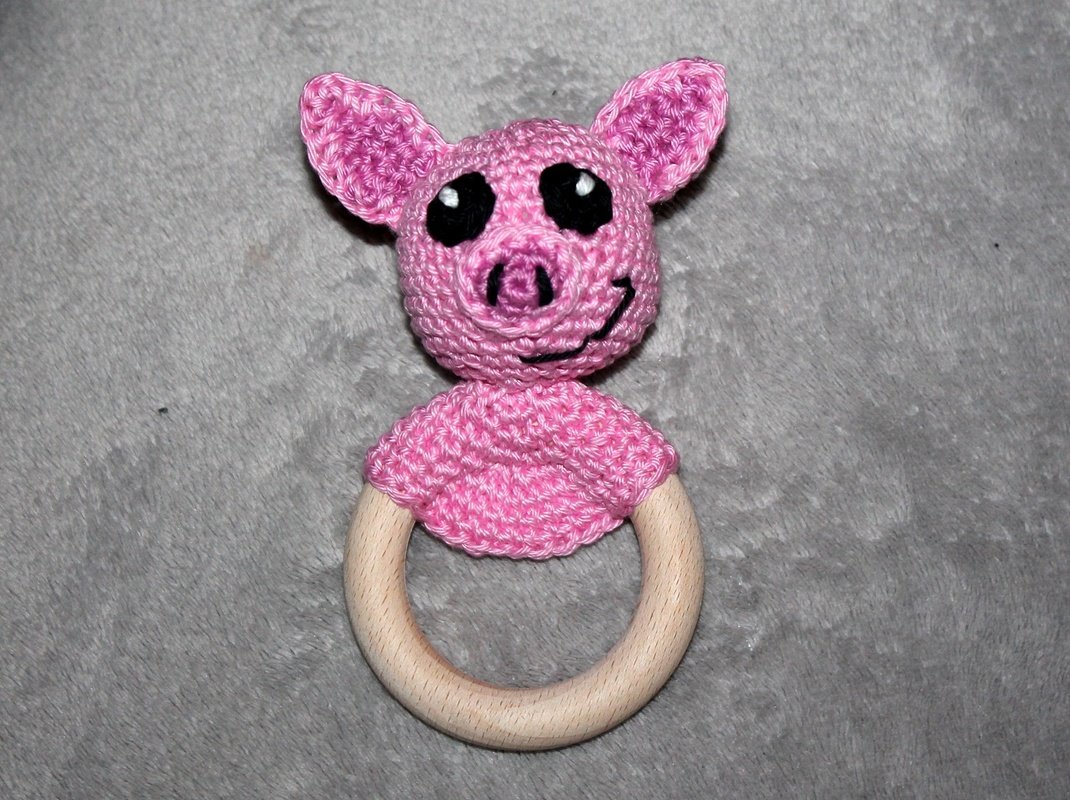 Das Schweinchen wird mit Sicherheit ein super Spielgefährte für die erste Zeit werden. Er wird fertig gehäkelt ca 12 cm groß und ist auch von einem Anfänger zu häkeln.
