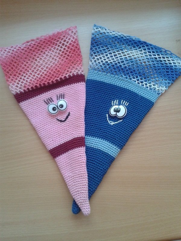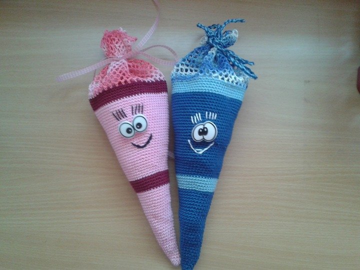 Dies ist eine Häkelanleitung für zwei Schultüten in der Größe von ca 35cm, bei in der Anleitung verwendetem Material und Nadelstäke.