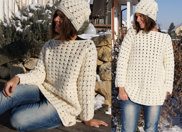 Ein Set für jeden Häkel-Fan! Dieser wunderschöner Long-Pulli in Oversize-Optik in den Größen S/M und L/XL in Kombination mit der Mütze ist ein echter Hingucker und macht sowohl zum Häkeln als auch im Kleiderschrank riesen Freude.