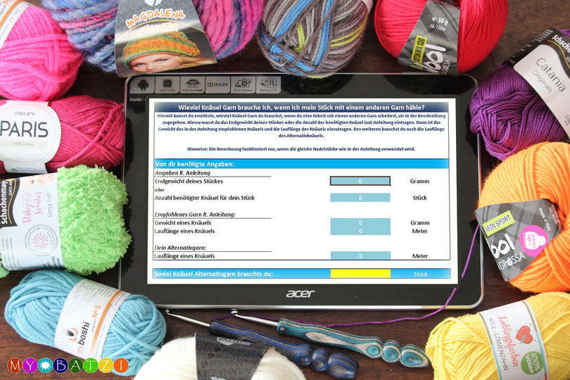 Diese Tabelle ist eine Hilfe für alle Häklerinnen und Strickerinnen. Denn mit ihr könnt ihr euch die Arbeit erheblich vereinfachen. Wie funktioniert das? Die Tabelle enthält folgende Rechner und Übersichten: