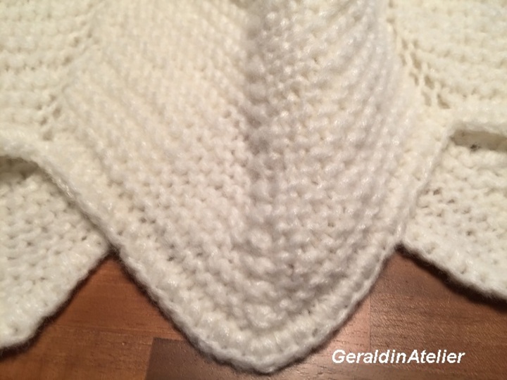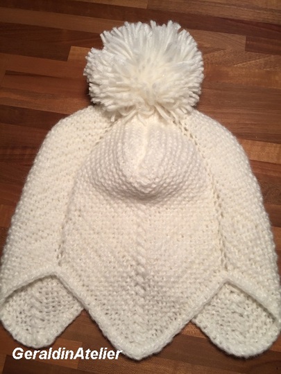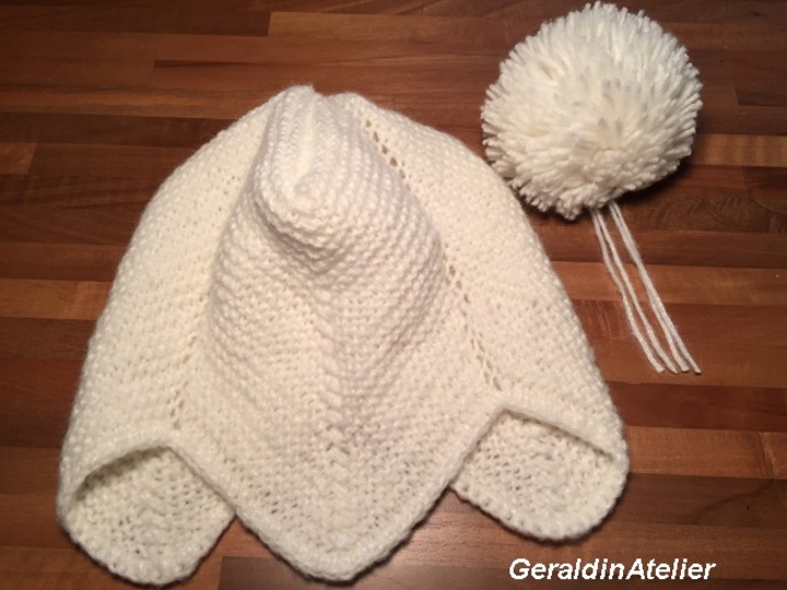 Die Mütze ist sehr leicht zum Stricken, besteht aus drei Winkeln, eins in der Mitte und zwei seitlich, so dass die Ohren abgedeckt sind. Jeder Winkel teilt sich in zwei Keile, die sich untereinander in reliefartigen Streifen verbinden.
