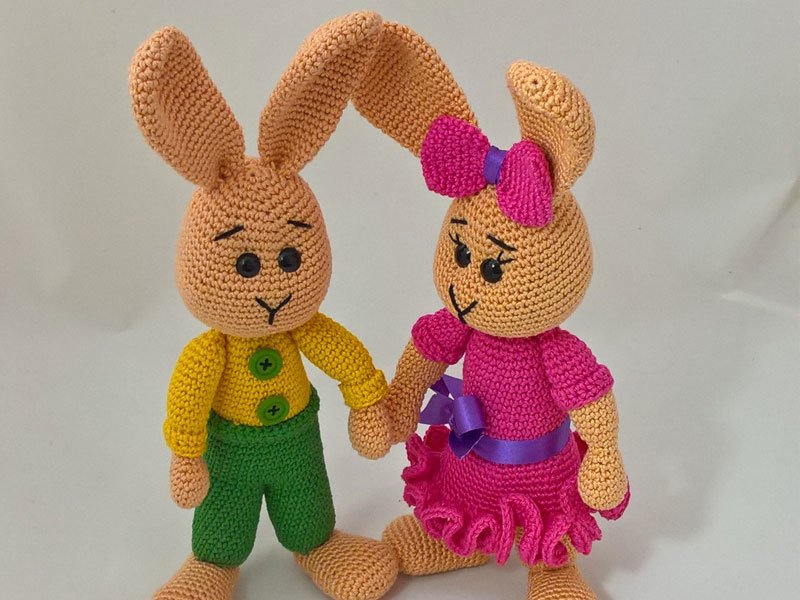 Die beiden sind niedliche 30cm groß - von den Füßen bis zu den Löffeln gemessen, wenn Du mit Baumwollgarn häkelst.