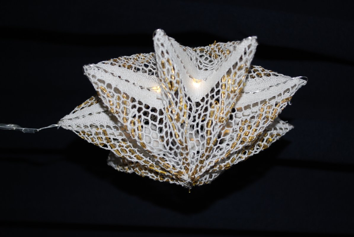 Die Anleitung ist für eine geklöppelten Stern mit ca. 17 cm Durchmesser und 10cm Tiefe. Der Stern ist in zwei Teilen mit ungeschnittenen Fäden geklöppelt und später zusammengenäht.