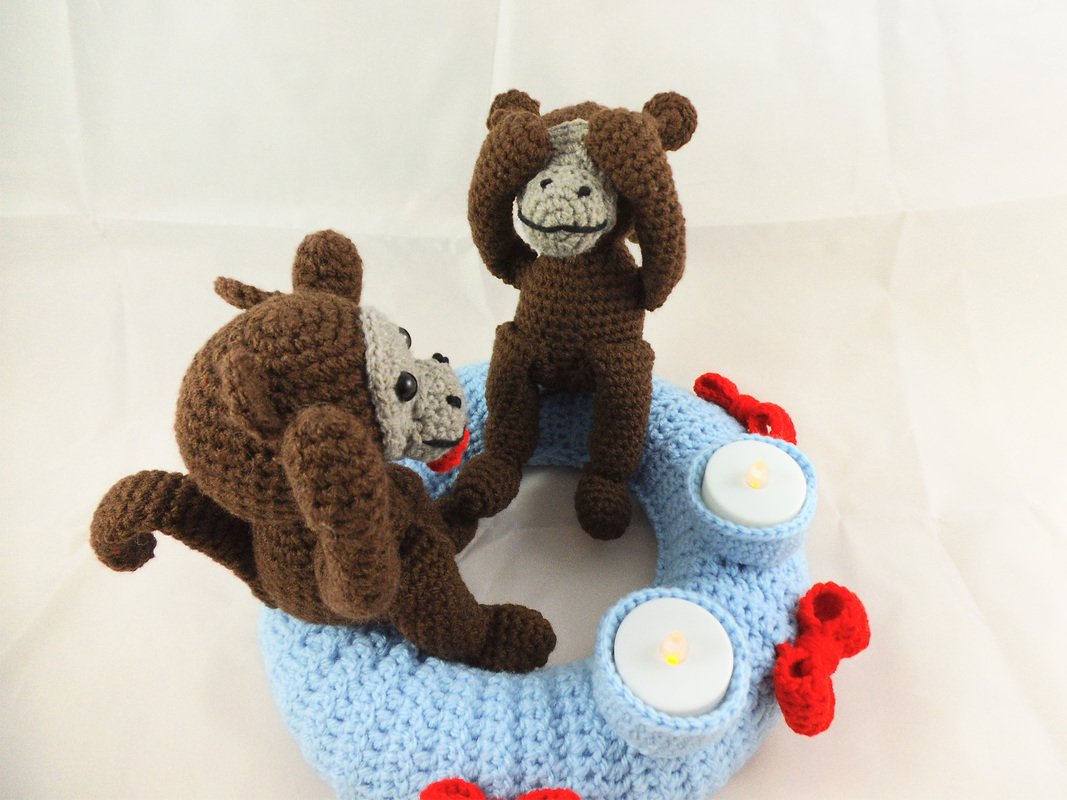 Verwendet habe ich Acrylwolle in braun, beige, hellblau, rot und einen Rest in schwarz, Sicherheitsaugen in schwarz (10mm Durchmesser), Häkelnadel 3,5mm, Styroporkranz 22cm Durchmesser, Füllwatte, Wollnadel, ggf. Stecknadeln und natürlich 2 LED-Teelichter