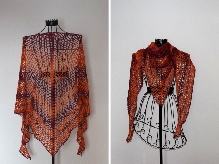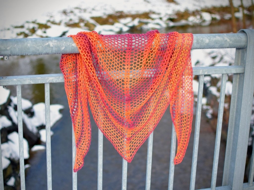 Das Tuch Sonnenaufgang ist ein besonders luftiges Tuch, für das man verhältnismäßig wenig Wolle braucht. Im Prinzip kann man dieses Tuch mit so ziemlich jeder (Farbverlaufs-)Wolle häkeln.
