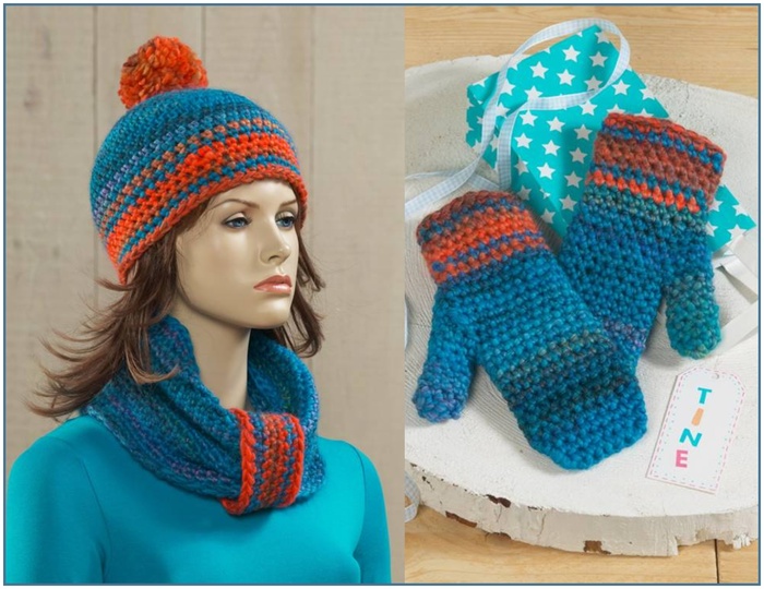 Material für die Fäustlinge, die Mütze und den Loop insgesamt: 400 g Blau (Farbe 757.0078) und 200 g Orange (Fb 757.0059) „Mille Colori Big“ (50% Schurwolle, 50% Polyacryl, LL = 190 m/200 g) von LANG YARNS. Je 1 PRYM-Häkelnadel Nr. 10 und 1 Pomponset von PRYM.