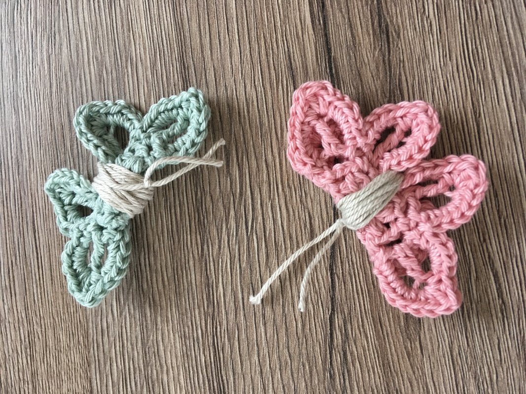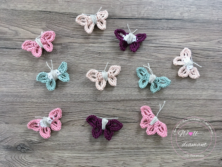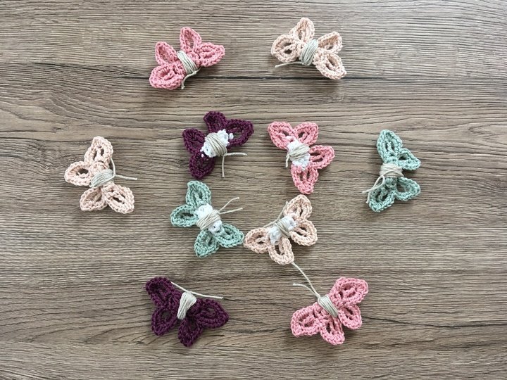 Die Schmetterlinge sind ca. 5 cm groß. Je nach verwendeter Wolle und Häkelnadel variiert die Größe. Mit einem dickeren Garn und iner größeren Nadelstärke wird der Schmetterling größer.