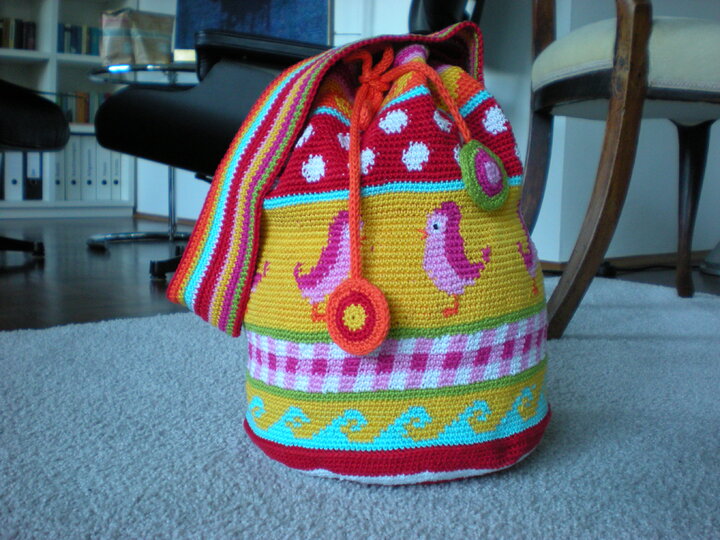 Mit so einem Mochilla - Häkelbeutel häkelst Du Dir einen absoluten Hingucker. Der Beutel hat einen Durchmesser von ca. 28 cm und eine Höhe von ca. 32 cm.