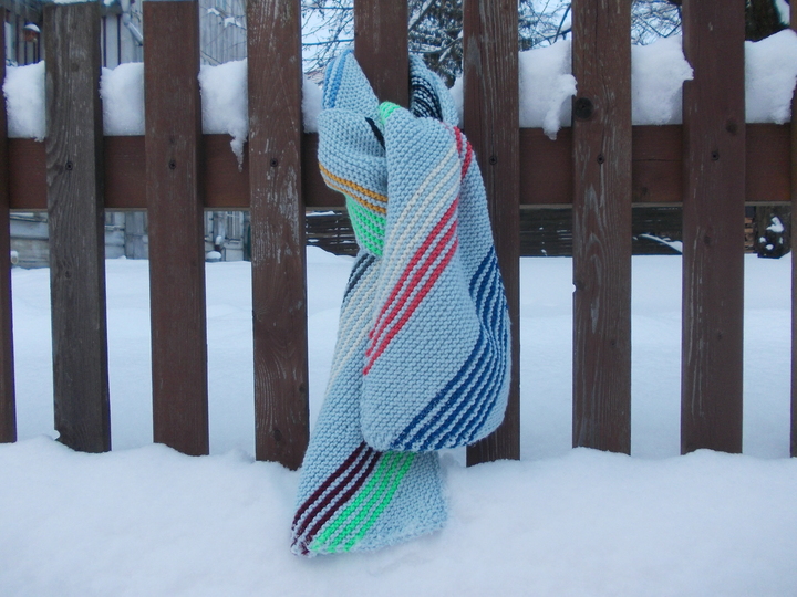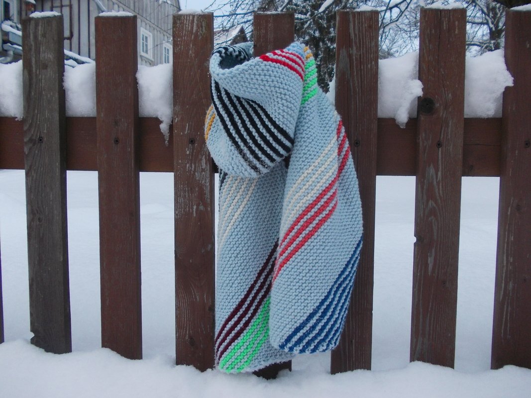 In wenigen Stunden ist er fertig gestrickt, denn durch die bunten Streifen kommt keine Langeweile auf. Die schräge Strickrichtung entsteht durch Zunahmen am Anfang, welche ich aber ganz genau beschrieben habe. Ich habe ein Wollmischgarn mit 85 m auf 50 g und eine Rundstricknadel Nr. 6 verwendet und habe insgesamt 250 g verbraucht, wobei die Streifen ca. 50 g Wollreste sind. Er ist ca. 23 cm breit und 135 cm lang.