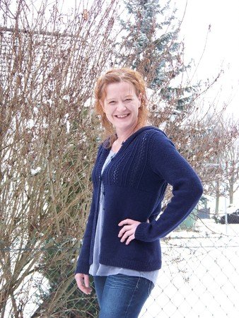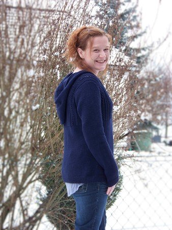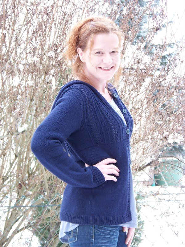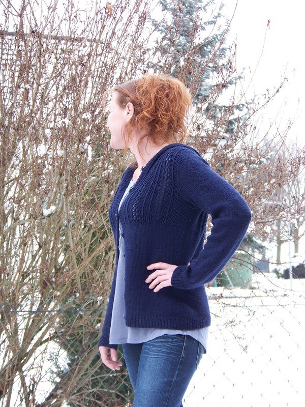 Die Jacke wird von oben nach unten, an einem Stück und ohne Nähte gestrickt.
