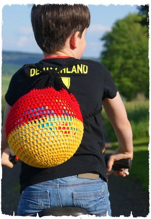 Die Bälle von meinen Kids liegen immer überall herum, garade jetzt zur Fussball WM. Deshalb habe ich mal ein Ballnetz gehäkelt und gleich kam den Jungs die Idee, ich solle mal einen Ballsack passend zur WM in Deutschlandfarben arbeiten. Mit dem Zugbandband kann das Netz einfach in Garage oder an der Garderobe aufgehängt werden. Mit einer Schnalle und Knopf dran, kann das Netz auch als Rucksack, schräg umgehängt oder als normaler Rucksack getragen werden. So sind die Hände frei und man kann bequem mit dem Fahrrad zum Beispiel zum Spielplatz oder Fußball-Training fahren. Das Netz ist super schnell gearbeitet und du kannst auch auf Wunsch Restgarn verarbeiten.