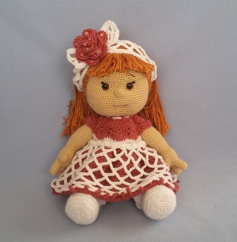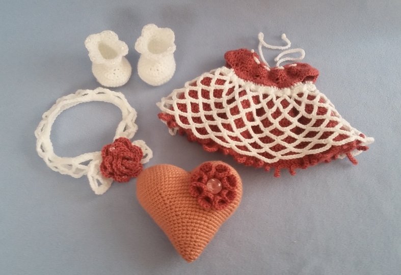 Die PDF beinhaltet die Anleitung für die Puppe, das Kleid, die Strümpfe, das Haarband, sowie für das Herz und die Rosen-Blüte.
