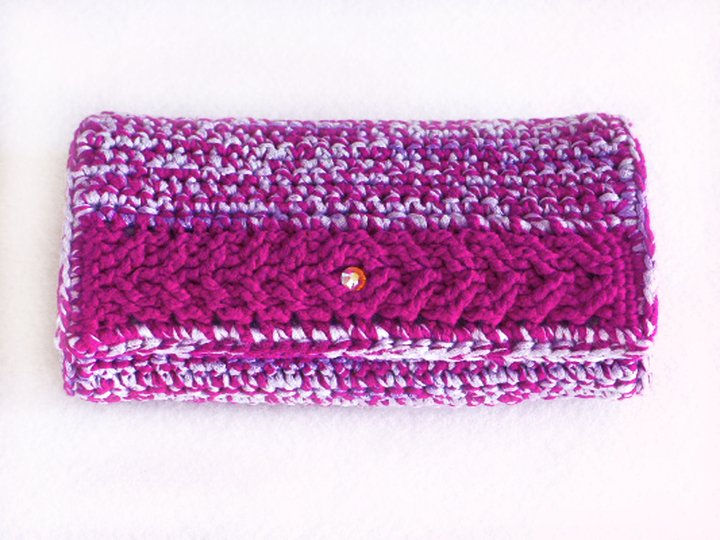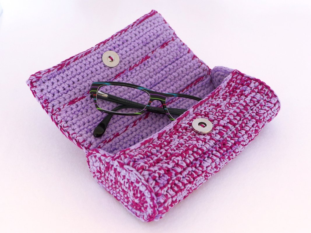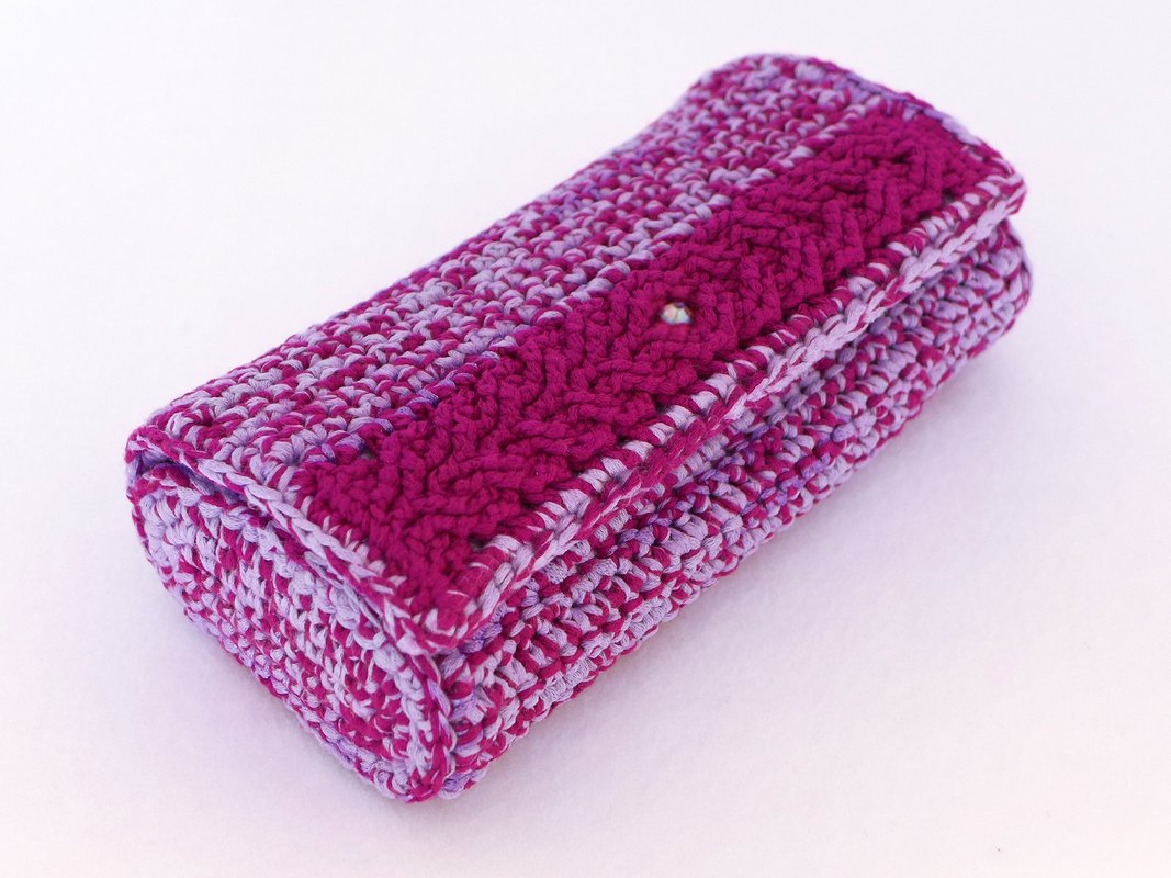 Und ein weiteres Brillenetui möchte ich euch gerne zeigen. Ein Traum in Fuchsia und Flieder, außen zweifarbig mit Kontrast-Häkelzopf-Kante und innen uni. Verschlossen wird es über einen Magnetknopf. Darin ist jede Brille gut aufgehoben.