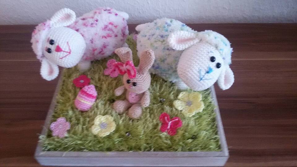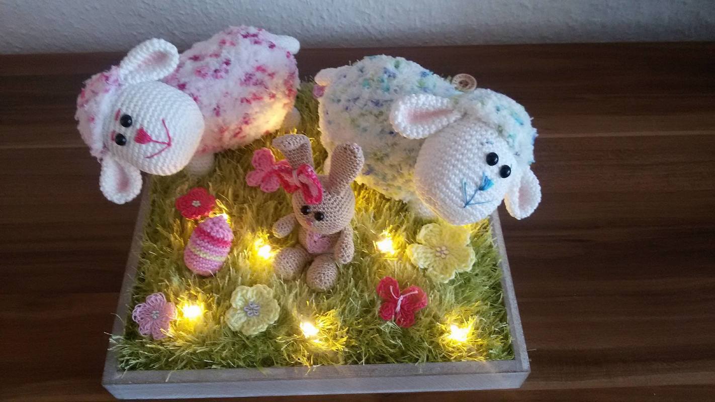 Ostern kann kommen, diese tolle Wiese wäre doch genau die richtige Deko Idee. Die Anleitung beinhaltet : Schaf, Hase, Wiese, Blumen, Shmetterlinge und Ei. Einfach nach zu häkeln und auch für Anfänger geeignet