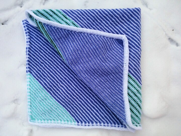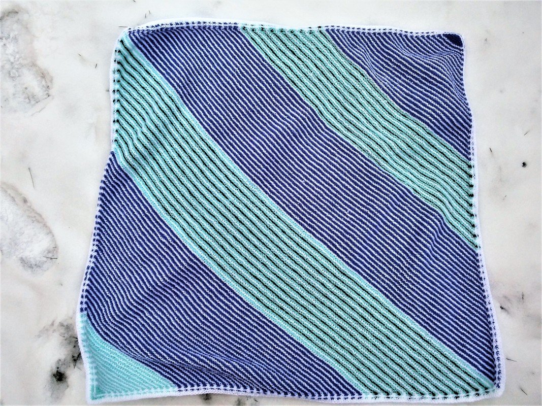 Das besondere an der 1 X 1 m großen Decke ist der liebevoll gearbeitete Rand, der alle Farbwechsel und Fadenreste verschwinden lässt und dem Ganzen ein professionelles Aussehen gibt. Die Decke sieht zwar hinten und vorne nicht gleich aus, aber beide Seiten sind gleich schön anzusehen.