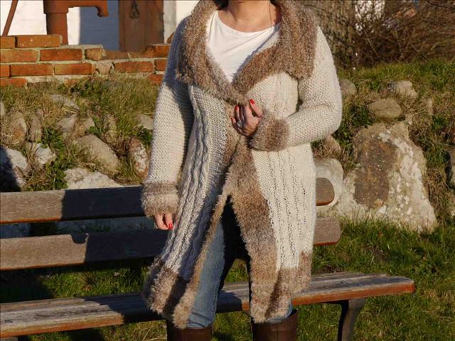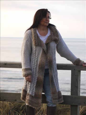 Ein Strickmantel oder etwas kürzer gearbeitet eine Strickjacke ,die nicht nur kuschelig warm hält sondern auch richtig stylish mit einem Zopfmuster auf den beiden Vorderteilen der Jacke daher kommt .Die Jacke kann offen getragen werden oder mit Haken und Öse unsichtbar geschlossen werden,damit das schöne Flauschgarn gut zur Geltung kommt.