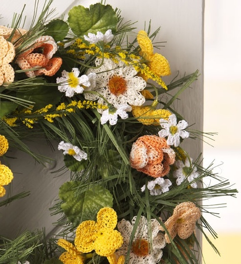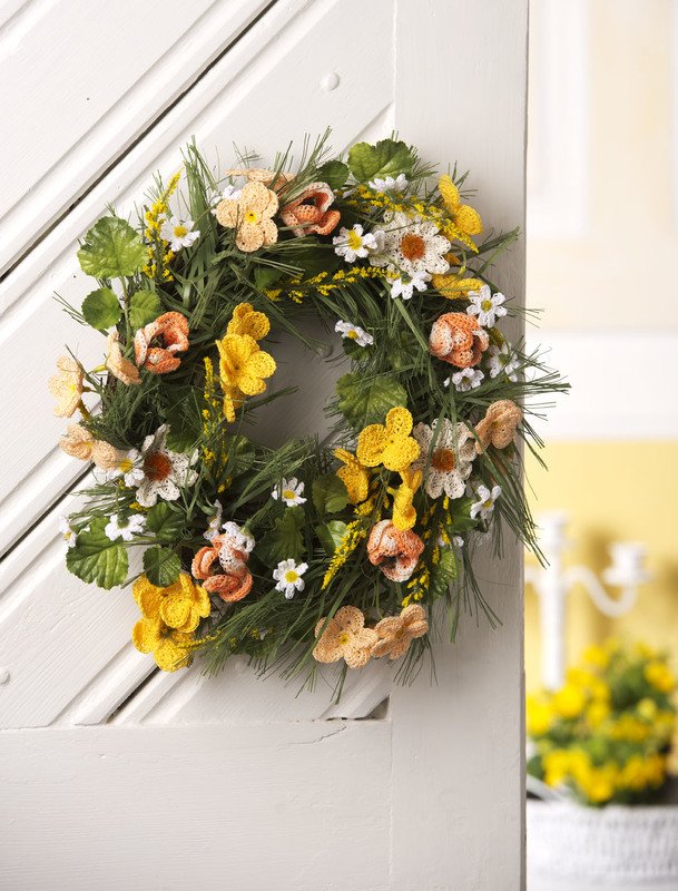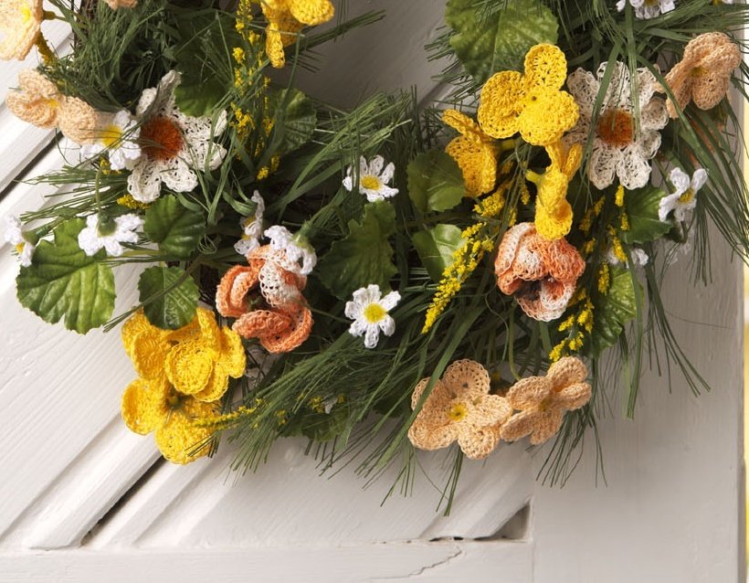 Baumwollgarnreste der Stärke 10 in Weiß, Gelb, Apricot und Orange meliert, 1 Blumenkranz mit Frühlingsblumen aus Textil z. B. von Weltbild, 1 Häkelnadel Nr. 1,5.