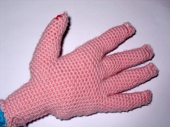 Meine Häkelnadel hat die Stärke 3. Die Hand besteht ausschließlich aus festen Maschen.