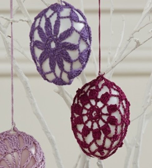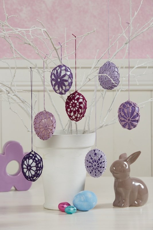 Baumwollgarnreste der Stärke 10 (LL ca. 265 m/ 50 g) in beliebigen Lilatönen bzw. in Natur, je 1 Plastik-Ei mit Öse von 6 cm Höhe in beliebiger Farbe, 1 PONY Häkelnadel Nr. 1,5.