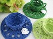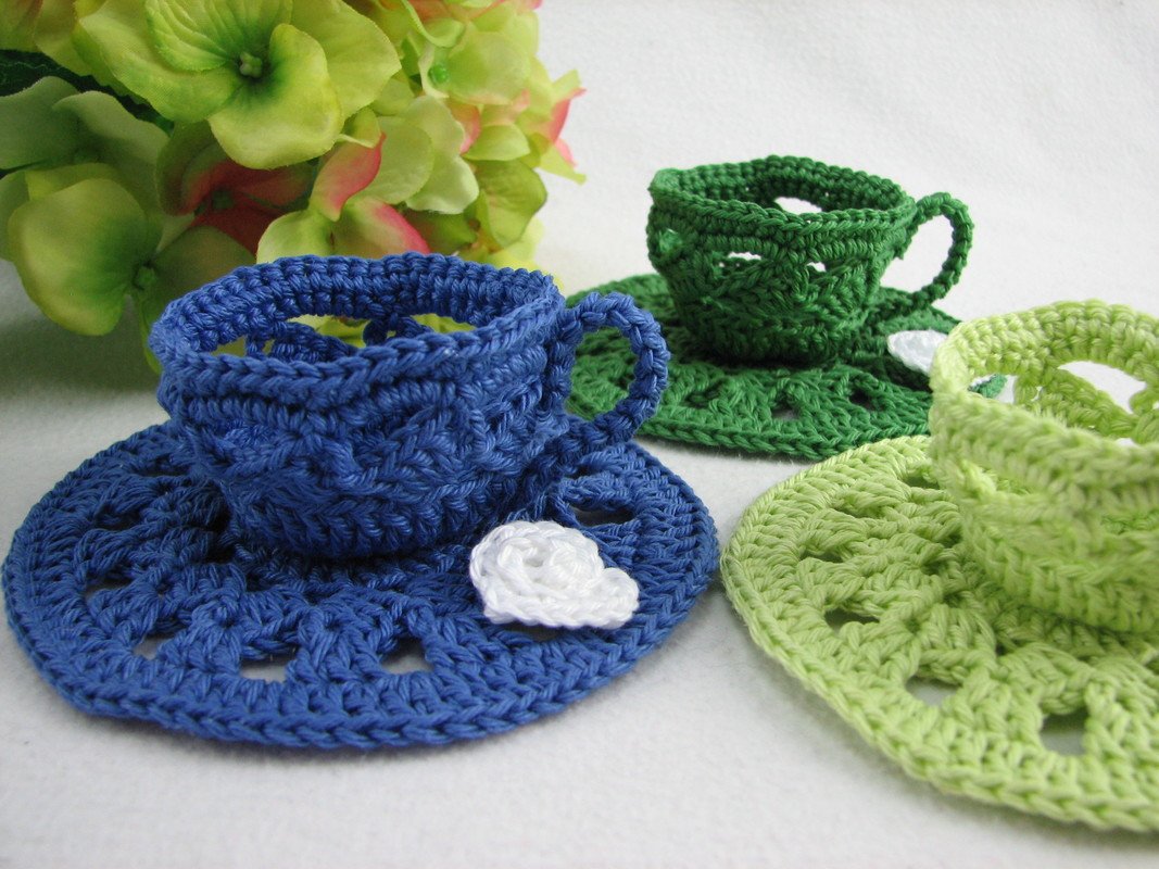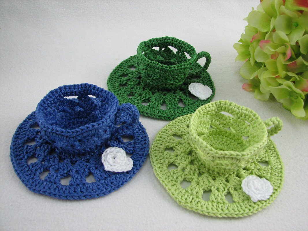 Ich habe das Garn Catania von Schachenmayr verarbeitet. Pro Tasse benötigt man ca. 10 bis 15 g. Der Teller hat einen Durchmesser von ca. 10,5 cm, die Tasse oben einen Durchmesser von ca. 5 cm, die Höhe beträgt ca. 3,5 cm. Wenn Sie anderes Garn verwenden, werden die Tassen dementsprechend kleiner oder größer.