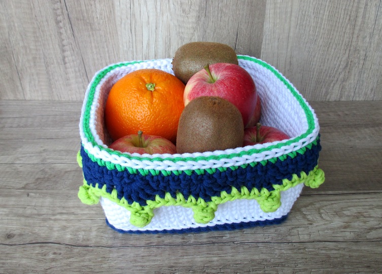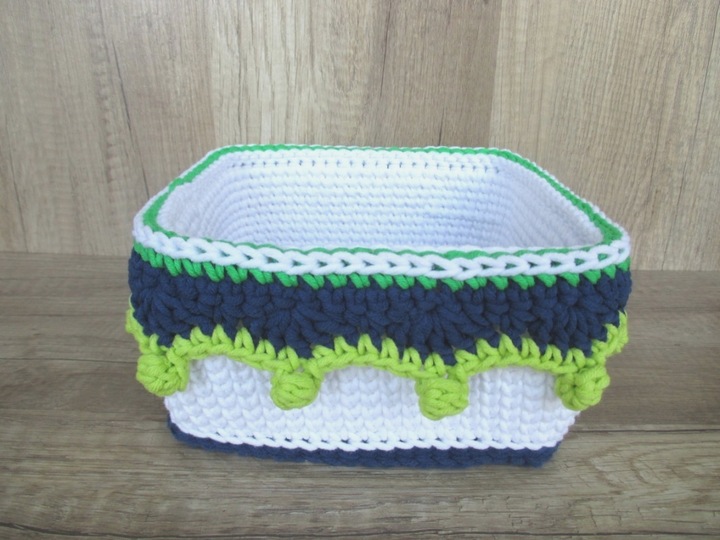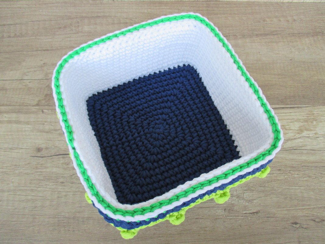 der Korb etwa 19 x 19 cm breit und 9,5 cm hoch. Du kannst aber jede Wolle (mit passendern bzw. etwas kleinerer Nadelstärke) verwenden und so kleinere oder auch größere Körbe häkeln.