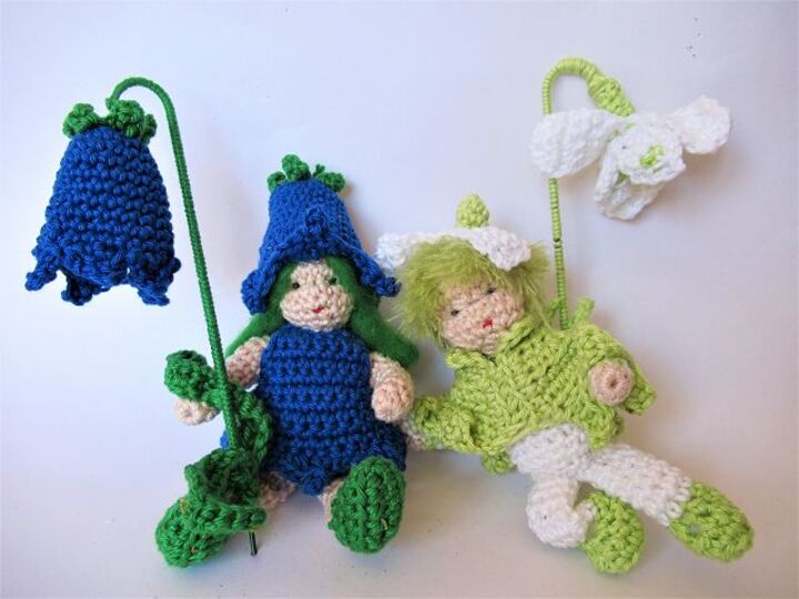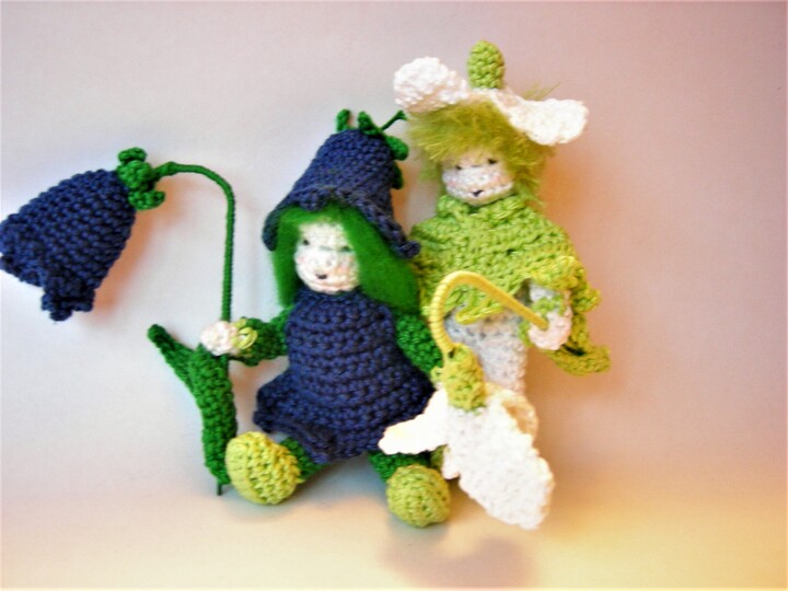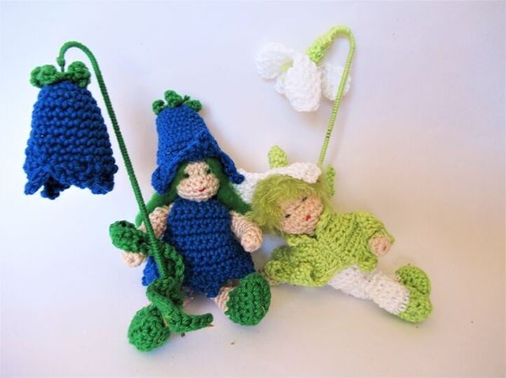 Die beiden Püppchen werden, mit dem angegeben Garn gehäkelt, etwa 13 cm hoch.